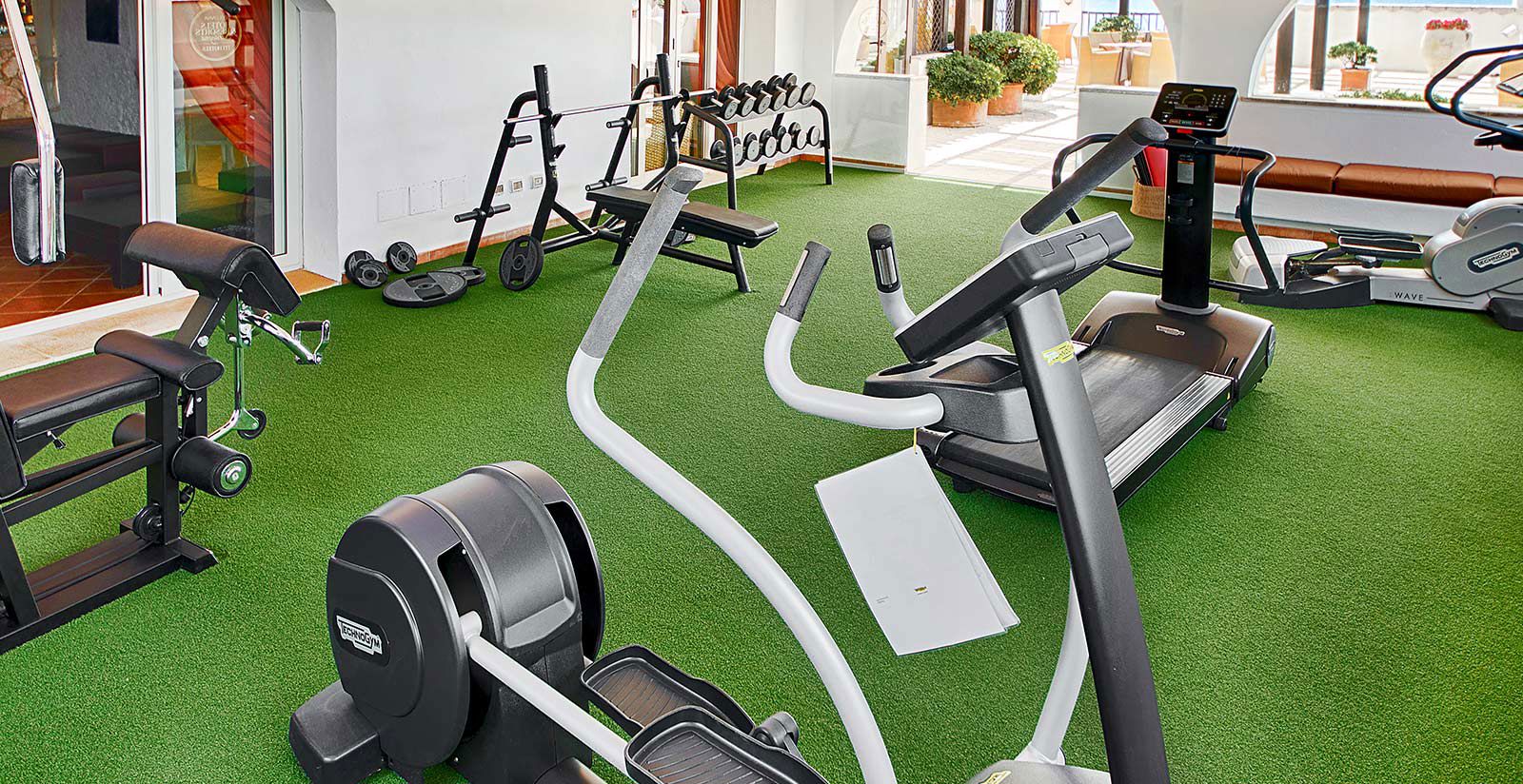El gimnasio del Colonna Grand Hotel Capo Testa se encuentra en la última planta del hotel y dispone de un área equipada con máquinas Technogym.